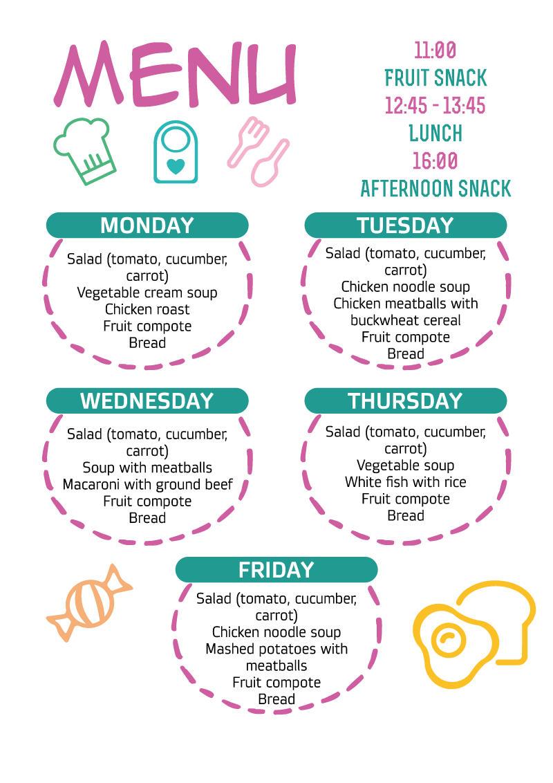 Our healthy, nutritious, delicious menu is prepared onsite each day by our professional chef. Designed specifically with the dietary needs of children in mind and prepared each day with love, our menu is a huge hit with all of our students… and our staff!